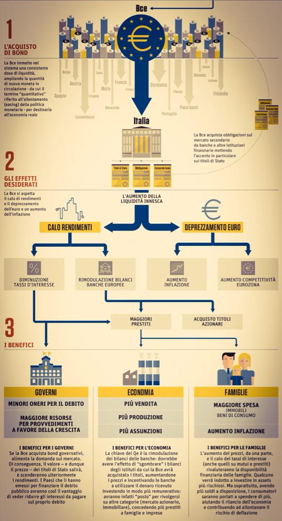 Riassunta la manovra (storica) di oggi, che ha fatto subito scattare il rally in Borsa, proviamo a capire che risultati hanno prodotto i Qe già messi in campo da altre grandi banche centrali, quali sono i rischi di un allentamento di questa portata, che effetti potrà produrre sulle economie dell’eurozona (e sull’Italia) una iniezione così potente di liquidità e quali saranno, verosimilmente, le difficoltà di applicare il piano ad un continente peculiare come l’Europa.