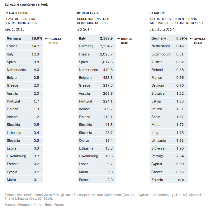 Come una profezia che si autoavvera, attesa praticamente da tutti, la Banca centrale europea (Bce) ha ufficializzato il Quantitative easing (Qe), l’acquisto di titoli di stato dei paesi membri dell’Unione per contrastare la spirale deflattiva che soffia da sud e portare l’inflazione vicina al target del 2%. Una manovra che supera le previsioni del mercato che scommetteva su acquisti per 50 miliardi al mese per 22 mesi (1.100 miliardi di euro). Invece la Bce rilancia con 60 miliardi di acquisti combinati (titoli pubblici e privati) per 19 mesi (il tetto è fissato al 25% degli acquisti a ogni emissione e 33% dei paesi emittenti), da marzo 2015 a settembre 2016 (per un totale di 1.140 miliardi), pronta a proseguire se ce ne fosse bisogno e l’inflazione non avesse raggiunto il target. Lo ha annunciato il presidente Mario Draghi, protagonista di una vera svolta nella turbolenta storia dell’eurozona che darà certamente serenità ai mercati allentando lo spread e respingendo la speculazione. Anche se l’ex governatore di Bankitalia sulla partita decisiva della mutualizzazione dei rischi sui titoli sovrani ha dovuto mediare con i falchi della Bce, vincendo a metà. Per il resto, gli acquisti verranno ponderati sulla base della partecipazione che le rispettive banche centrali dei paesi membri (vedi tabella sotto) hanno nel capitale della Bce (su un montante di 600 miliardi nel 2015 per l’Italia significa un piano di acquisti che si aggira sui 104 miliardi). Con una postilla importante: il Consiglio direttivo è stato unanime nel riconoscere acquisto di bond come strumento di politica monetaria.