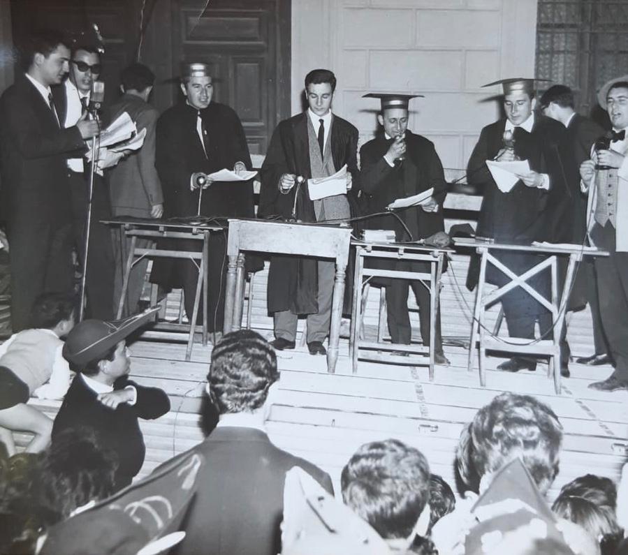 Mio padre è quello a sinistra con gli occhiali neri modello sole a mezzanotte. Il papà di Giampiero, di profilo, quello con i fogli in mano davanti al microfono. Poi ci sono Franco Pizzillo che indossa una toga da prof universitario; Totò Di Paola che finirà a lavorare ad Ivrea nell’ufficio del personale Olivetti; l’ingegner Ninetto Messina, sempre stato mingherlino; Totò Cassata, futuro magistrato antimafia; e mezza tagliata la sagoma di Pasquale Culotta, in panciotto e papillon.